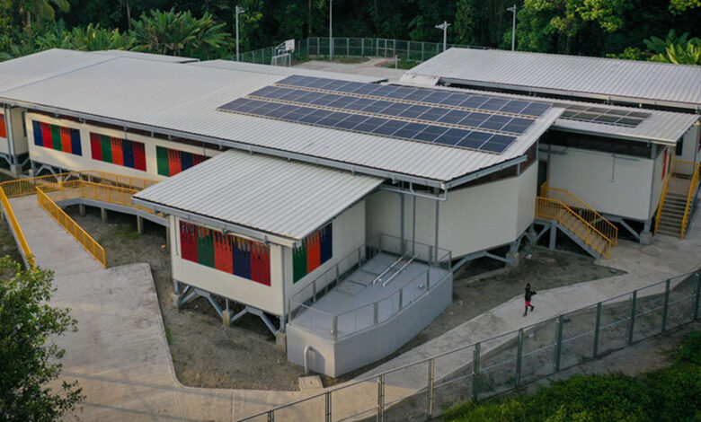 La infraestructura incluye aulas polivalentes, sistema de energía solar, servicios de enfermería, baterías sanitarias y acceso a agua potable, mejorando las condiciones para la comunidad educativa.