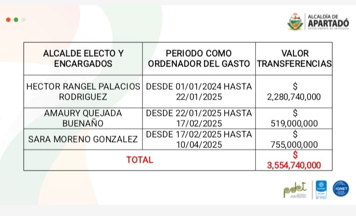 “El saqueo más grande a los impuestos que pagan los ciudadanos de Apartadó, de acuerdo con el mismo funcionario Montes, se ejecutó entre el 21 de mayo del 2024 y el 10 de abril de 2025 cuando se registraron cincuenta transacciones bancarias sin el lleno de los requisitos legales. Simplemente habrían una cuenta y pagaban, sin reserva presupuestal, sin planillas de salud, sin contrato, sin evidencias de ejecución”