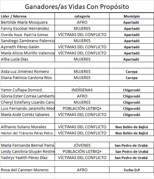 Jóvenes: personas entre los 16 y 28 años de edad, residentes en alguno de los 11 municipios de la región del Urabá antioqueño, que desarrollen trabajo con comunidades y sean reconocidas por su labor.