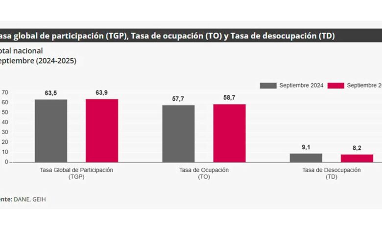 En las 13 principales ciudades del país y sus áreas metropolitanas la Tasa de Desocupación fue 8,1 %, mientras en septiembre de hace un año fue 9,2 %. La Tasa Global de Participación se ubicó en 66,4 % (66,2 % el año pasado) y la Tasa de Ocupación fue de 61 % (igual a la del año pasado).