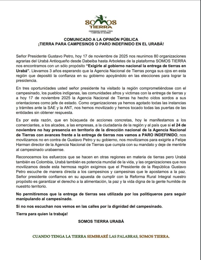 80 organizaciones sociales anunciaron un paro indefinido según ellos no contra Petro, sino contra la Agencia Nacional de Tierras, agotados los caminos del diálogo.