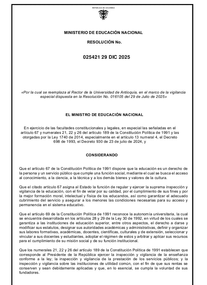 El Ministerio de Educación Nacional adoptó la medida administrativa que contempla el reemplazo del Rector y Representante Legal de la Universidad de Antioquia.