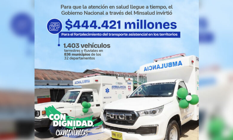 Con una inversión de $444.421millones de pesos el Gobierno del Cambio, a través del ministerio de Salud y Protección Social, adelanta uno de los principales proyectos estratégicos del sector para garantizar el transporte asistencial, incluyendo ambulancias básicas, fluviales y marítimas. Esta estrategia de fortalecimiento de la atención en salud asegura que millones de ciudadanos, ya sea en el campo o a las orillas de los ríos, reciban atención en salud oportuna y de calidad a lo largo de todo el territorio colombiano.