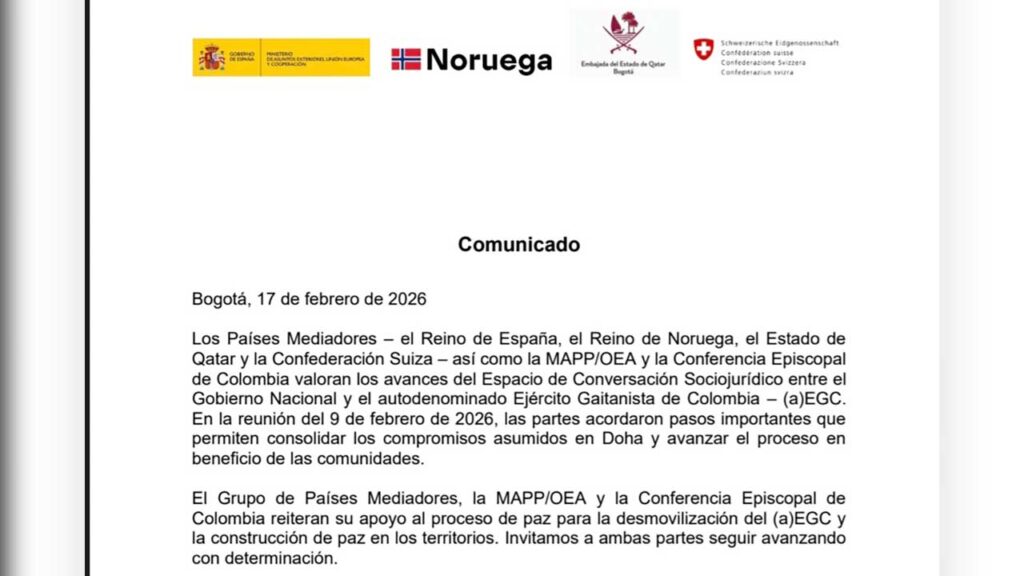 Los Países Mediadores, el Reino de España, el Reino de Noruega, el Estado de Qatar y la Confederación Suiza, así como la MAPP/OEA y la Conferencia Episcopal de Colombia valoraron los avances del Espacio de Conversación Sociojurídico entre el Gobierno nacional y el autodenominado Ejército Gaitanista de Colombia (EGC).