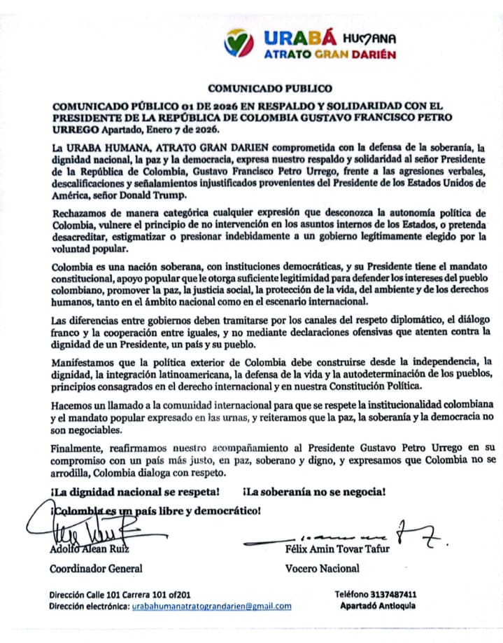 “La Urabá Humana, Atrato Gran Darien, comprometida con la defensa de la soberanía, la dignidad nacional, la paz y la democracia, expresa nuestro respaldo y solidaridad al señor Presidente de la República de Colombia, Gustavo Francisco Petro Urrego, frente a las agresiones verbales, descalificaciones y señalamientos injustificados provenientes del Presidente de los Estados Unidos de América, señor Donald Trump” dice en uno de sus apartes dicho pronunciamiento.