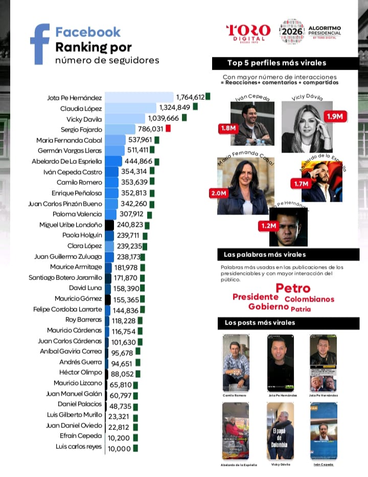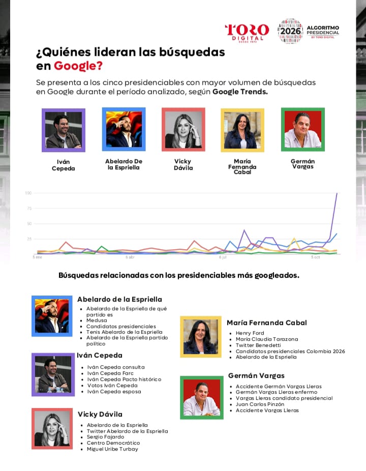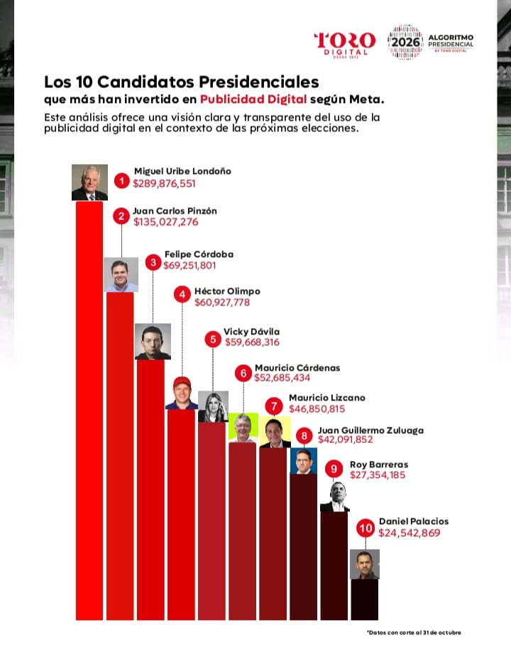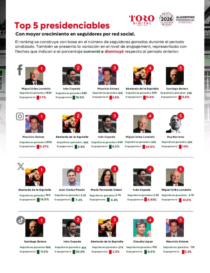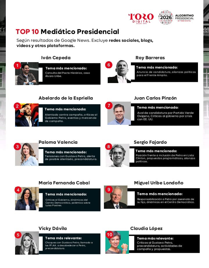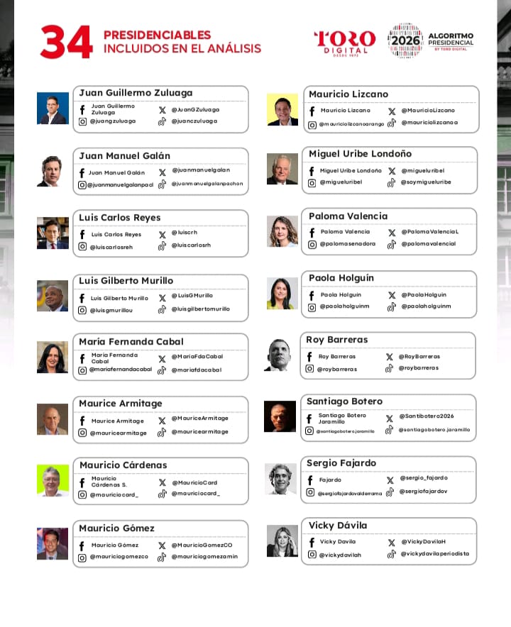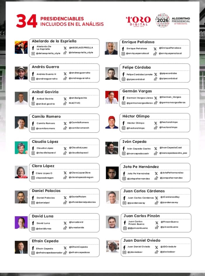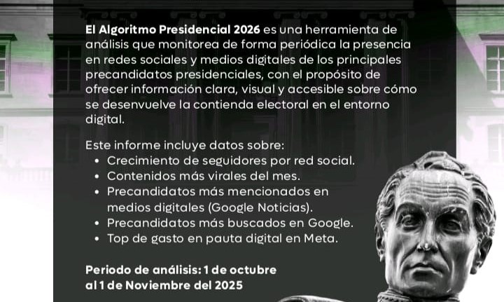 La 9.ª edición del Algoritmo Presidencial 2026 presenta un análisis de la presencia digital de los 34 precandidatos a la Presidencia, realizado entre el 1 de octubre y el 1 de noviembre de 2025.