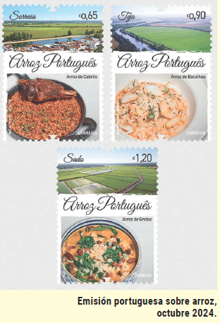 Con tres valores (0.65, 0.90 y 1.20 euros respectivamente), impresa en proceso offset, diseñada por Rodrigo Rodríguez, esta bella emisión nos presenta las áreas de cultivo arrocero de Mondego, Sado, Sorraia y Tejo, a la vez que muestra platos tradicionales con ese arroz.