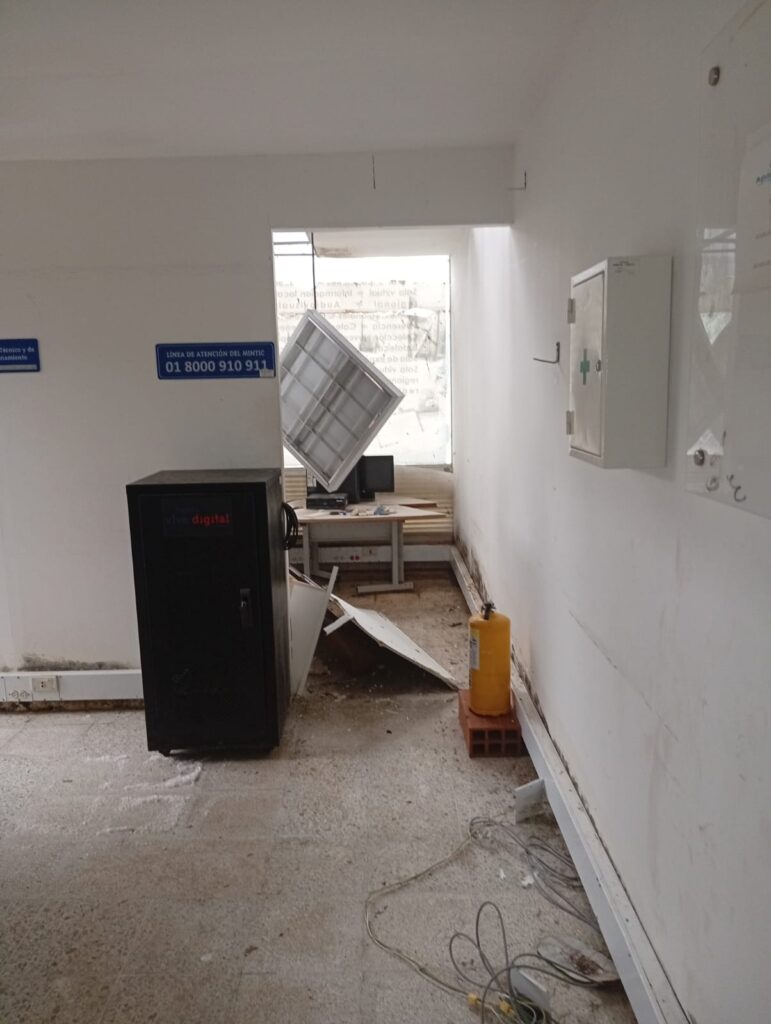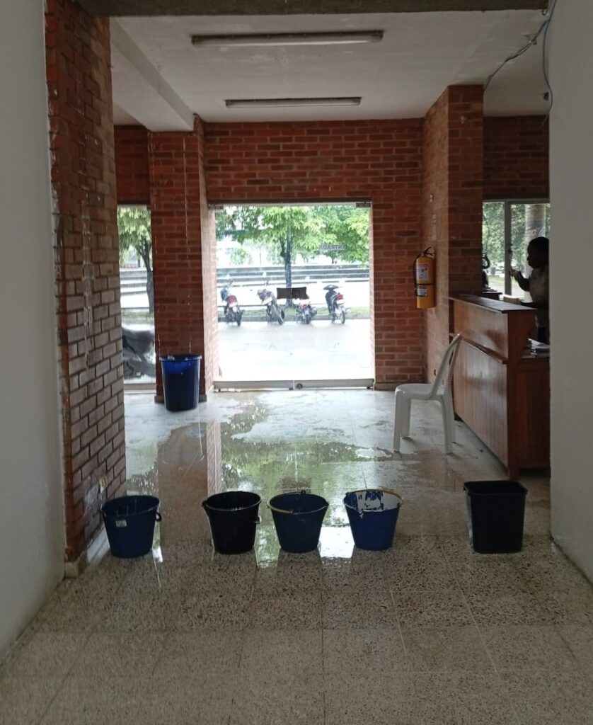 Los cielo rasos por el suelo, el agua entrando a chorros por los cuatro puntos cardinales y unos empleados desesperados bajo la angustia colocando tarros para   recoger el agua, pero todo resulta insuficiente. Además del mal estado de las baterías sanitarias.