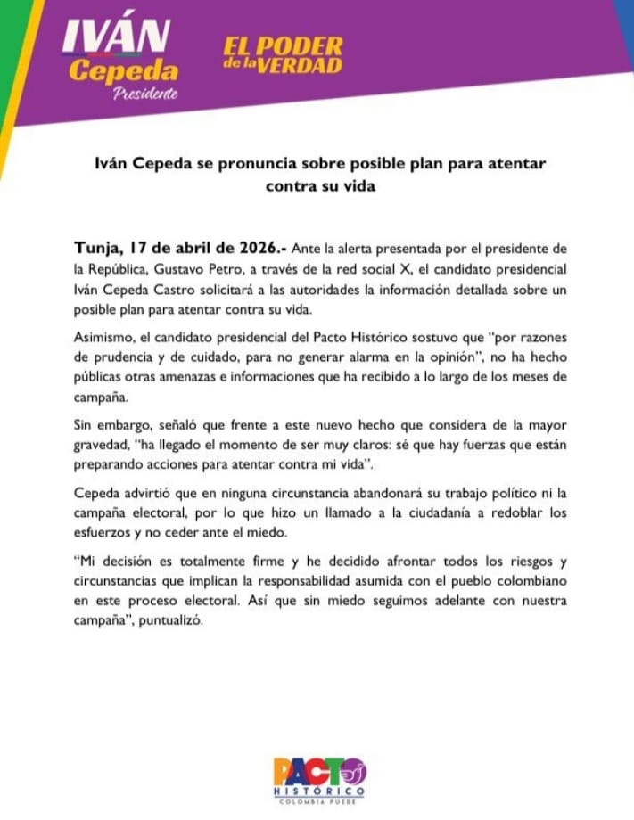 Cepeda Castro dijo por su parte que no va a interrumpir su agenda política y les pidió tranquilidad a sus seguidores, el candidato presidencial reveló que hace rato viene recibiendo información confiable sobre planes para asesinarlo y que espera reunirse con las autoridades para profundizar sobre el tema.