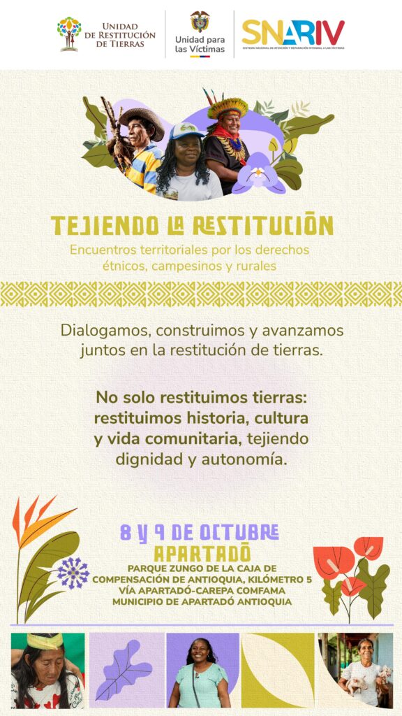 (Foto principal/la restitución de tierras, sigue su marcha) -Apartadó- La Unidad de Restitución de Tierras (URT) realizará, los días 8 y 9 de octubre en el Parque Zungo de Apartadó, la quinta Asamblea Regional ‘Tejiendo la Restitución’, un encuentro que congregará a comunidades indígenas, afrodescendientes y campesinas del Urabá antioqueño y chocoano, junto a entidades del orden nacional y territorial.